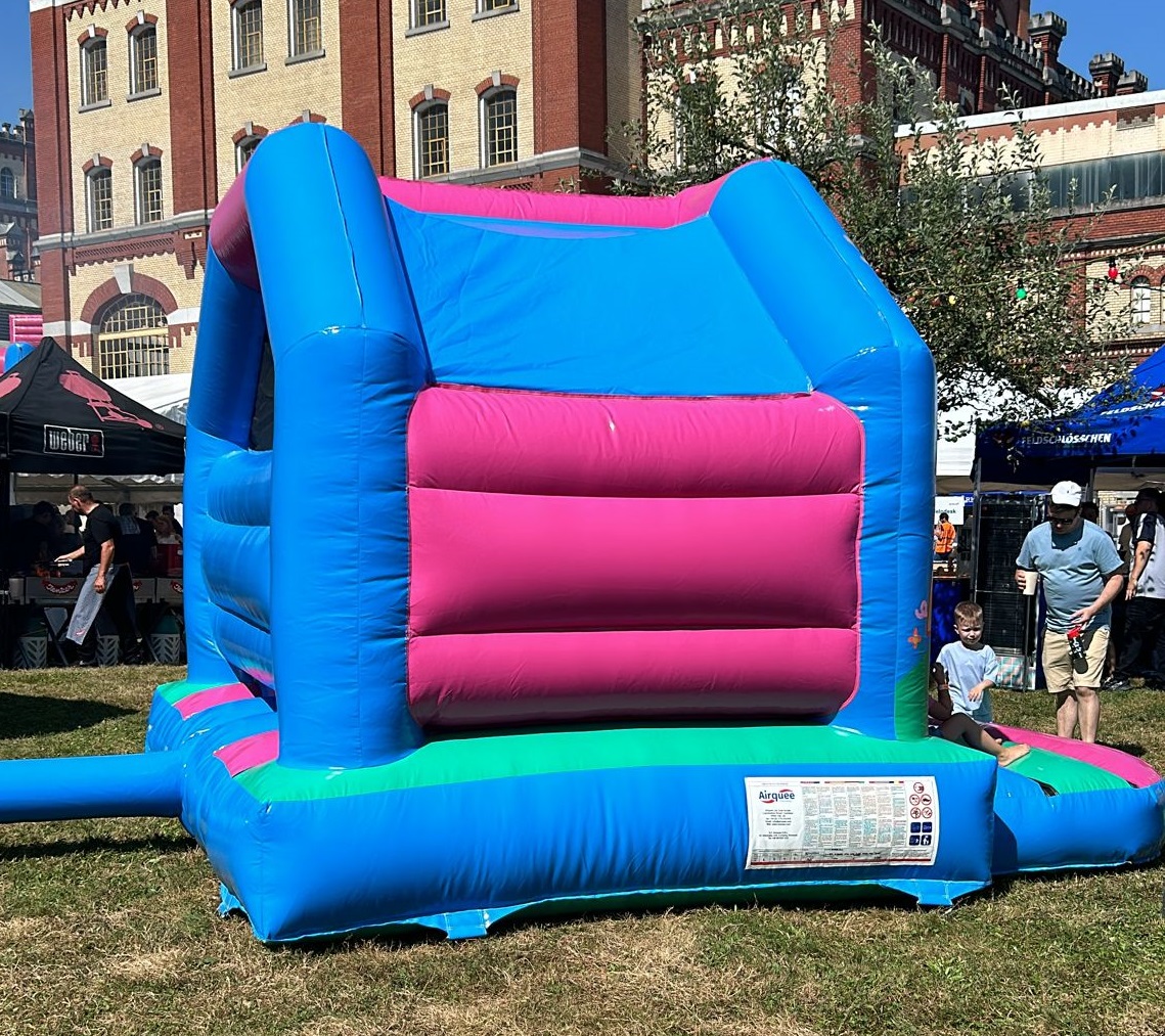 Diese Hüpfburg bietet ein Dach zum Schutz vor Regen und zu hoher Sonneneinstrahlung.