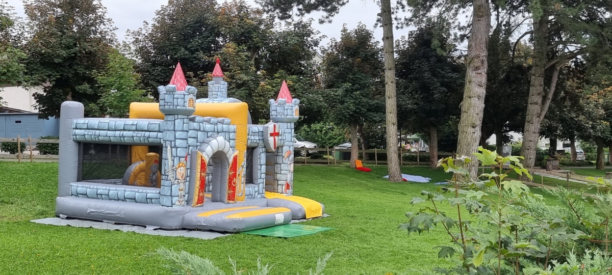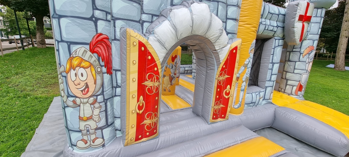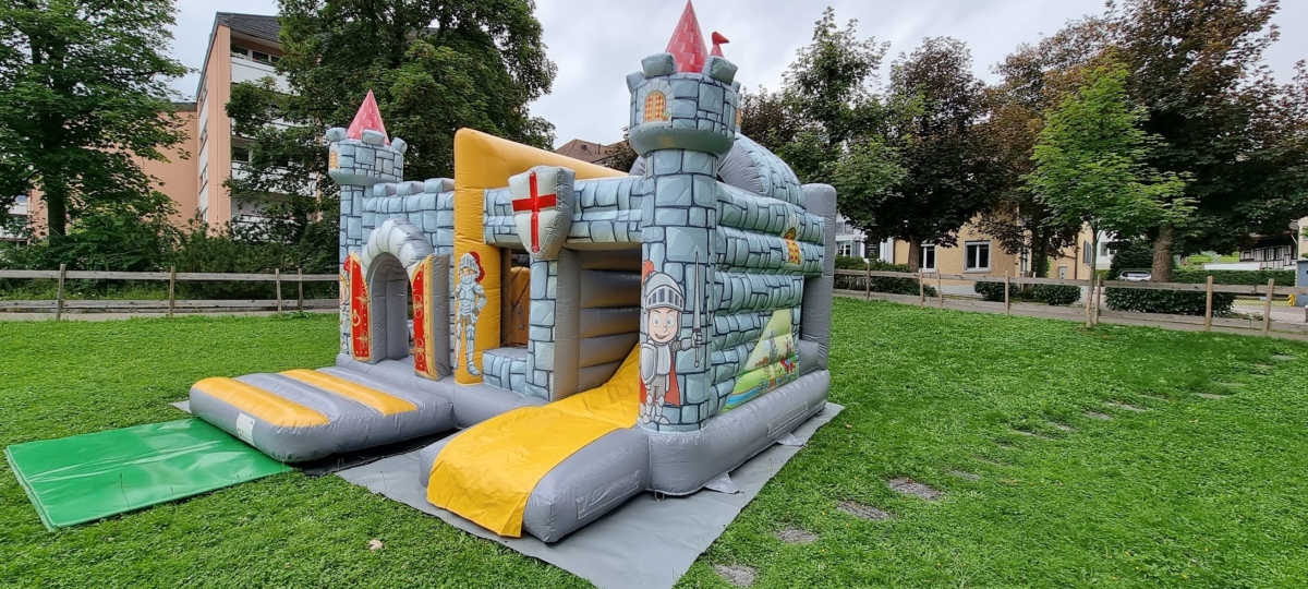 Ein Traum wird wahr: einmal als Ritter Kunibert auf und im eigenen Schloss toben, rennen & rutschen. Mit unserer grossen Ritterburg Hüpfburg können die Kinder in unterschiedlichen «Räumen» rutschen, spielen, toben und hüpfen. Diese Hüpfburg bietet auch ein schützendes Dach gegen Regen und zu hoher Sonneneinstrahlung.