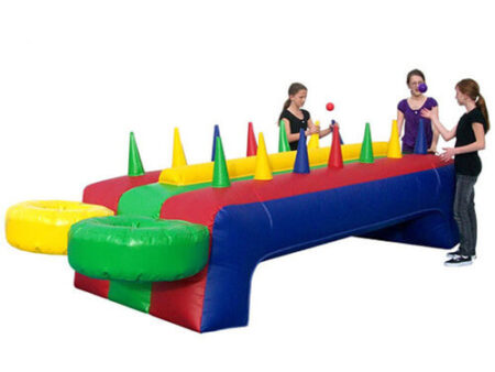 Lieferumfang: Spielgerät aufblasbar, Bälle, Gebläse, Unterlegplane, Kabelrolle, Sicherungsmaterial, Auf/Abbauanleitung.
