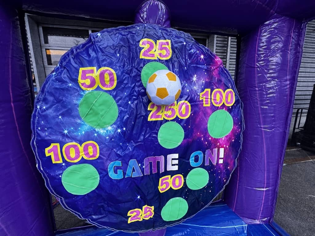 Aufblasbares Wurf und Gewinnspiel. Mit der Katapultschleuder müssen die Klettbälle an die Zielscheibe geschossen werden. Wenn diese an den Klettpunkten hängen bleiben zählt es die dazugehörigen Punkte. Ein super Spassfaktor für Personen jeden Alters. Fördern Sie die sportliche Aktivität Ihrer Besucher und tragen Sie spannende Wettbewerbe aus.