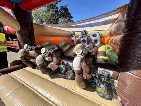 Die Hüpfburg ist mit drei Luftkanonen ausgestattet, mit denen die Ziele beschossen werden können. Die Bälle rollen automatisch wieder zurück, damit den Kindern immer ausreichend davon zur Verfügung stehen.