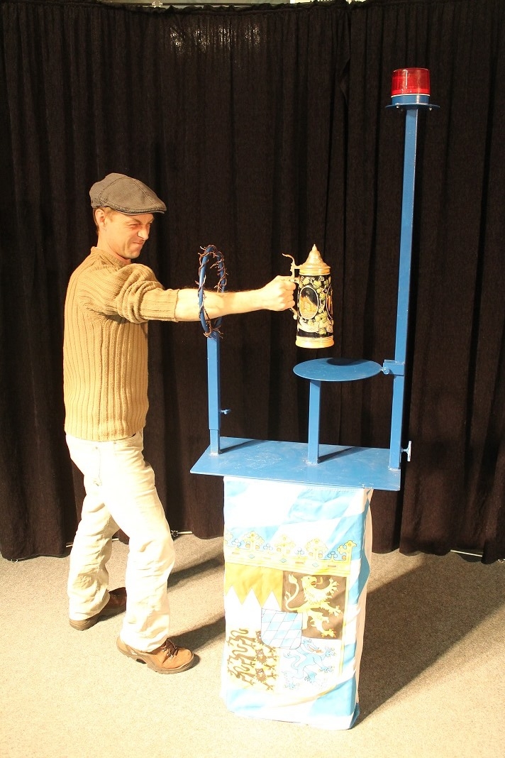 Lieferumfang: Bierkisten, Ständer mit Sound und Licht, Batterie, Bierhumpen mit Gewicht.