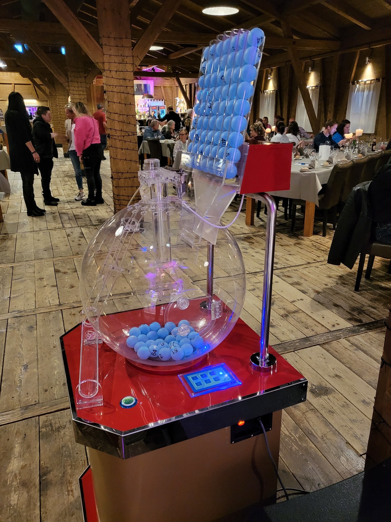 Wie im Fernsehen, macht diese elektronische Lottomaschine richtig was her. Die Bälle werden via Fernbedienung zu einem beliebigen Zeitpunkt in die Kugel gelassen und dann umhergewirbelt. Via Knopfdruck am Gerät oder mit der Fernbedienung kann man dann entsprechend die Bälle herausfiltern. Über einen attraktiven Lauf werden diese dann aus der Kugel heraus bis nach vorne gerollt. Dort sind die Gewinnzahlen dann immer zu sehen.
