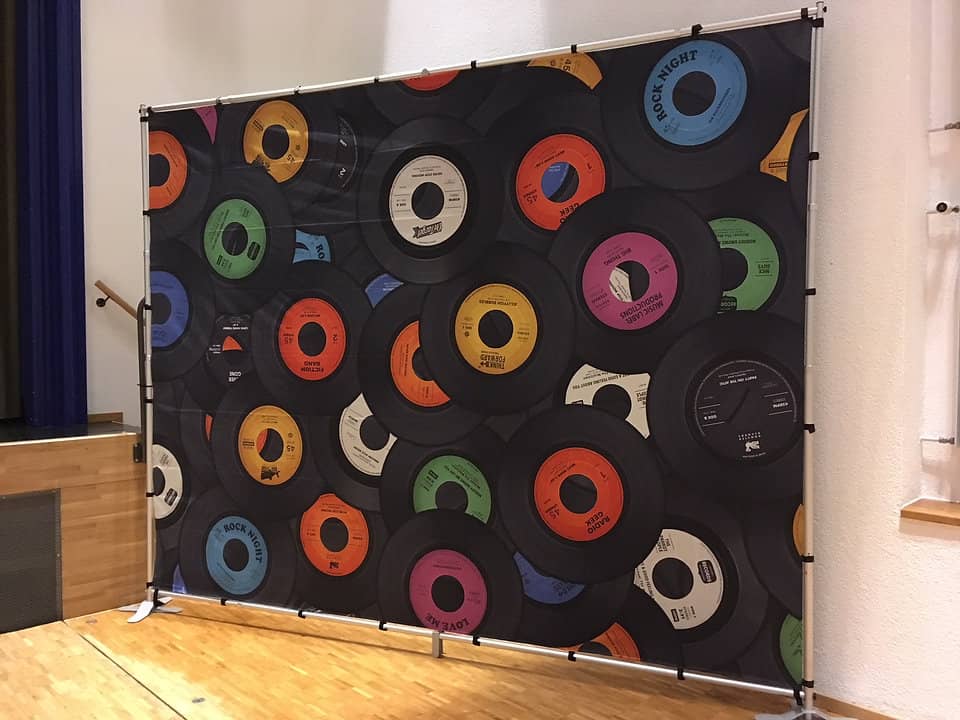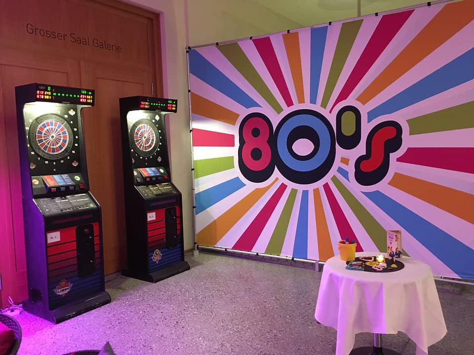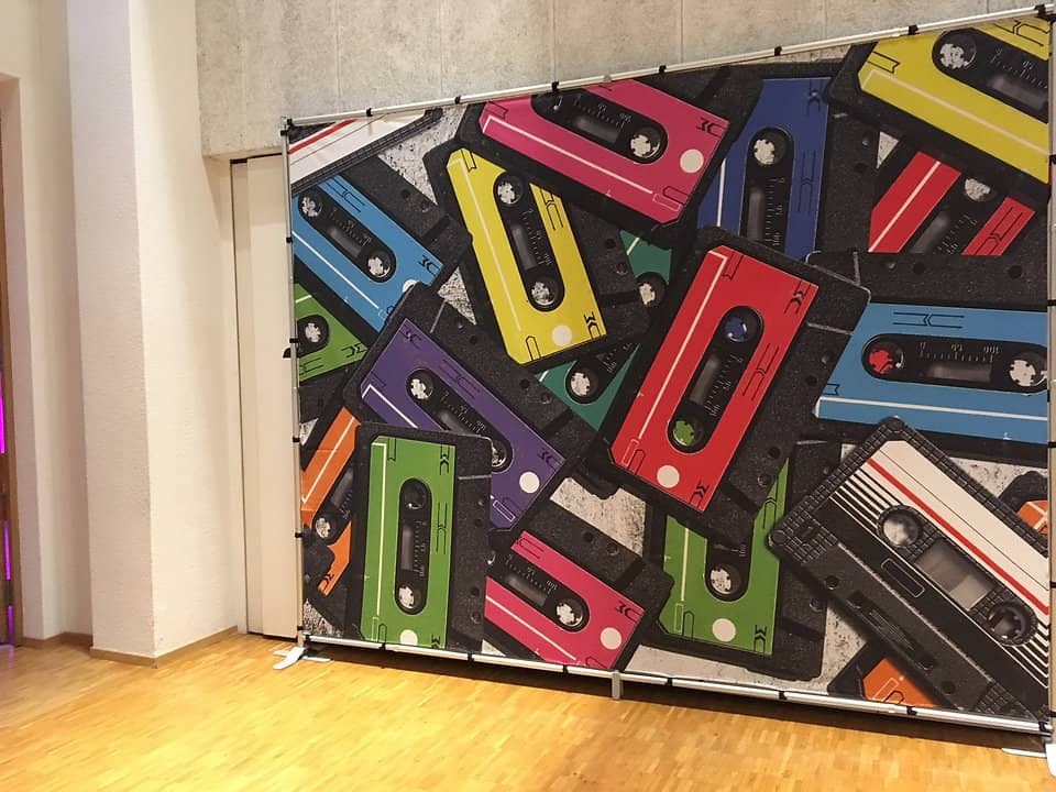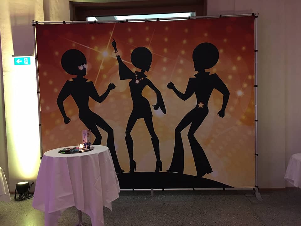 Selbststehende Dekorationsrückwände passend zum Thema 70er und 80er Jahre. Es stehen diverse Sujets zur Auswahl. Als abwechslungsreiche Dekoration für Ihre Retro-Party, Hintergrund für Bar oder Tanzbereich.