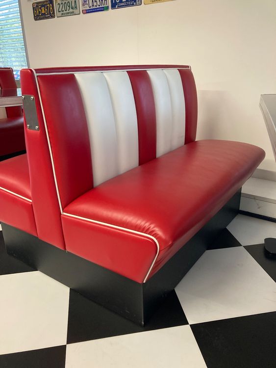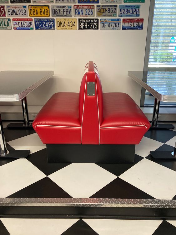 Der Retro Designklassiker Tisch aus den 50er /60er Jahren in rot-weiss. Diese coole Bank aus Kunststoff in leuchtendem Rot bringt den Diner-Look direkt auf Ihren Event.