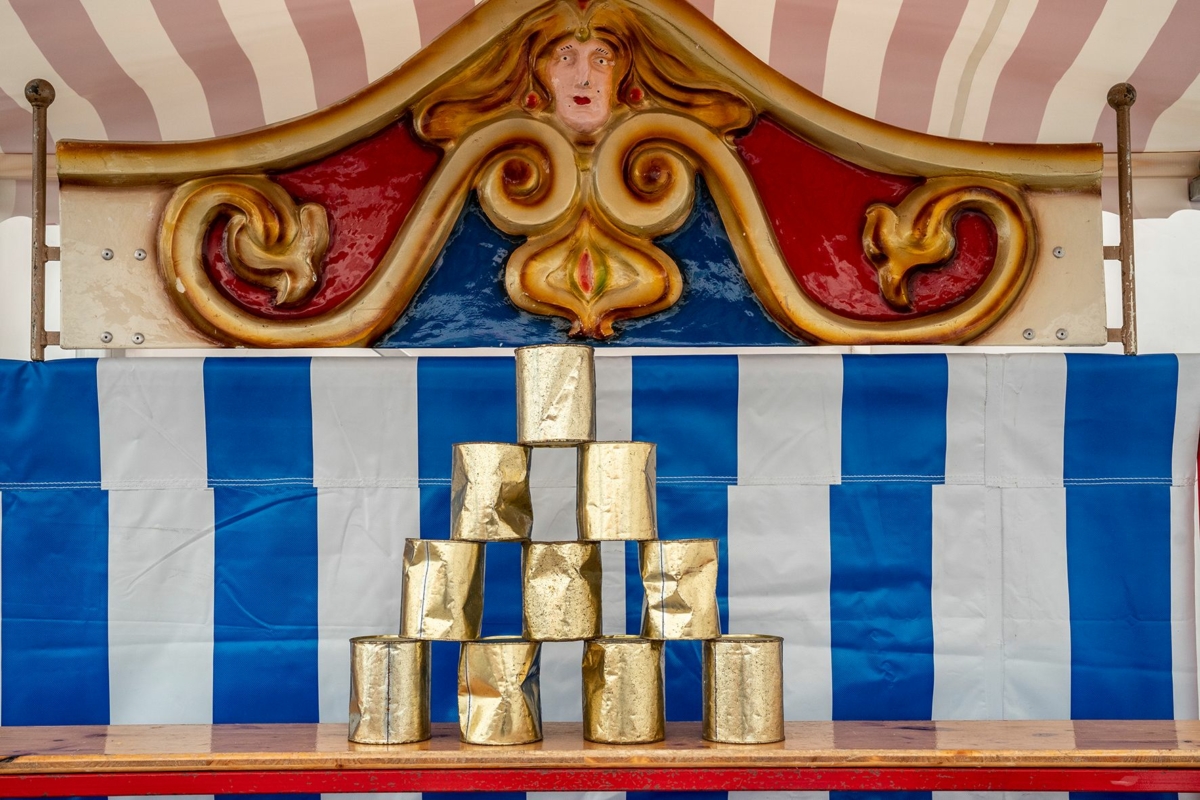 Spielstand „Dosenwerfen Oktoberfest“. Sie erhalten einen blau-weiss dekorierten Marktstand mit Dosenwerfen-Aufsatz. Dazu eine Abwurfstation und natürlich die Dosen und Bälle.