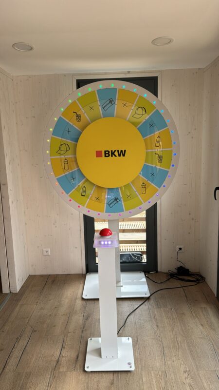In der Gestaltung sind wir frei und können die gesamte Elektronik in verschiedenen Gehäuseformen unterbringen. Standardmässig bieten wir unser rundes Glücksrad mit einem Durchmesser von 140cm und 24 Feldern an. Hier haben Sie verschiedene Brandingmöglichkeiten der einzelnen Felder sowie auf der grossen Zentrumsscheibe.