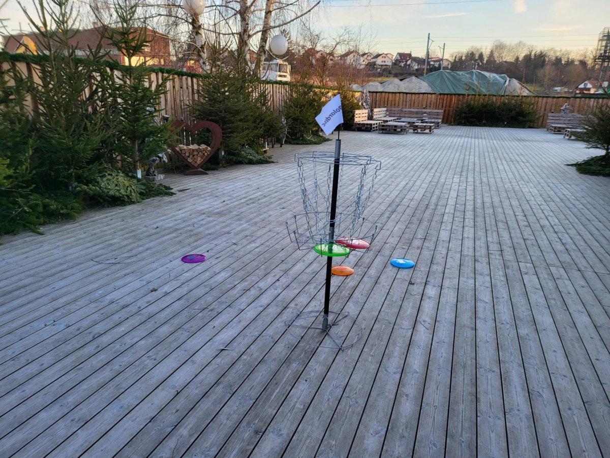 Lieferumfang: 10 x Frisbee, 1 x Ständer als Fangkorb.