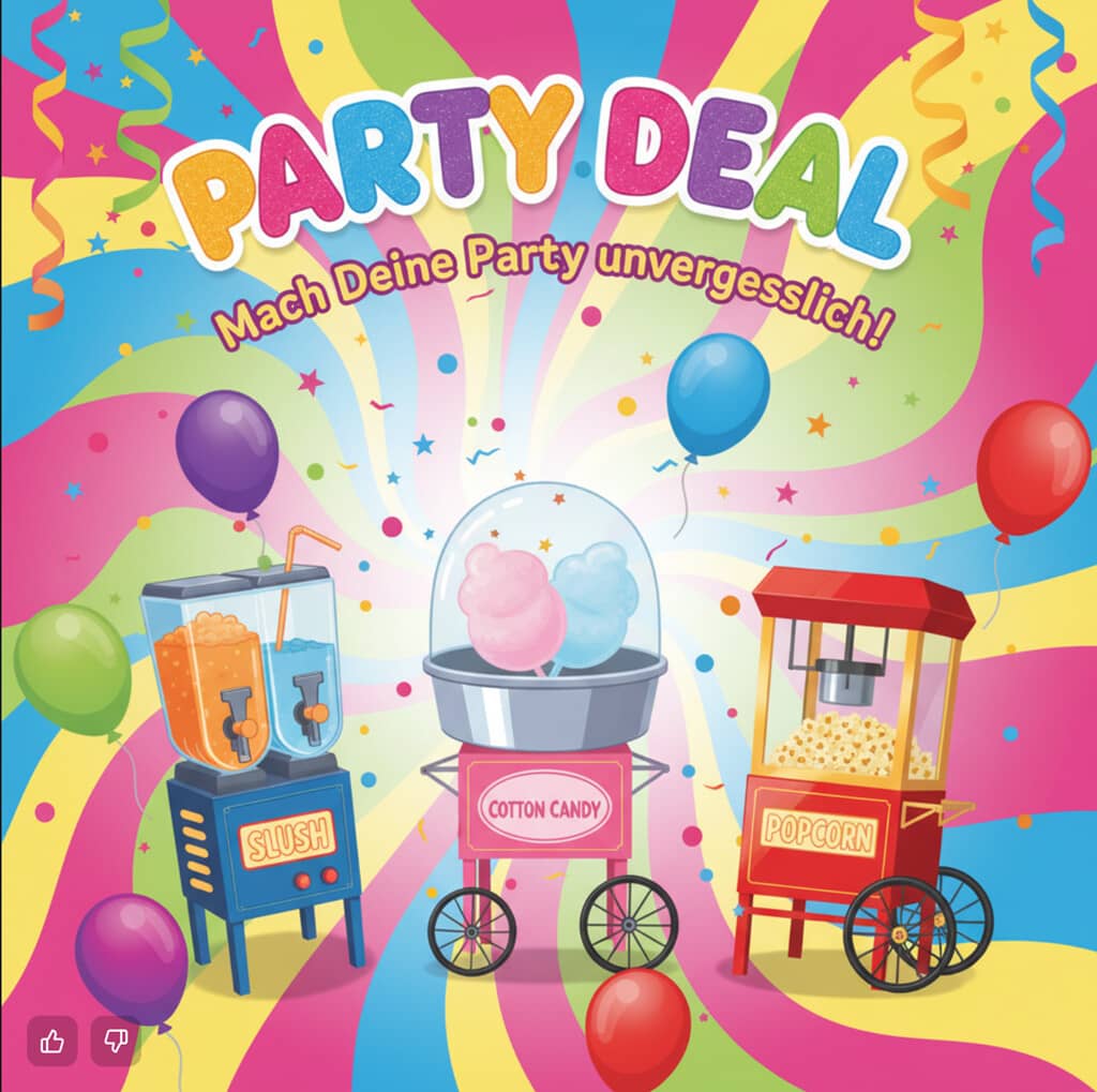 Hier bieten wir unseren Party Deal speziell für Kindergeburtstage und Private kleinere Partys an. Sie haben die Wahl aus verschiedenen professionellen Maschinen welche zu einem spzeill günstigen Preis zur Verfügung stehen auszuwählen. Der Unterschied zu unseren grossen Profi Maschinen ist tatsächlich die Kapatzität und Produktionsgrösse pro Stunde. Auch sind diese Maschinen eher etwas kleiner und leichter zu transportieren.