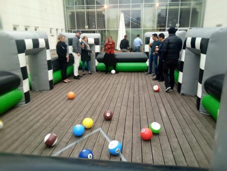 Fussball und Billard: Diese Kombination bietet viel Spass und Action auf Ihrem Event! Unser grosses Fussball-Billard-Spielfeld ist in wenigen Minuten einsatzbereit. Mittels gezielter Schüsse mit der weissen «Kugel», in diesem Fall ein weisser Lederball, müssen die halben bzw. die vollen Bälle in den sechs «Löchern» des Spielfelds versenkt werden.