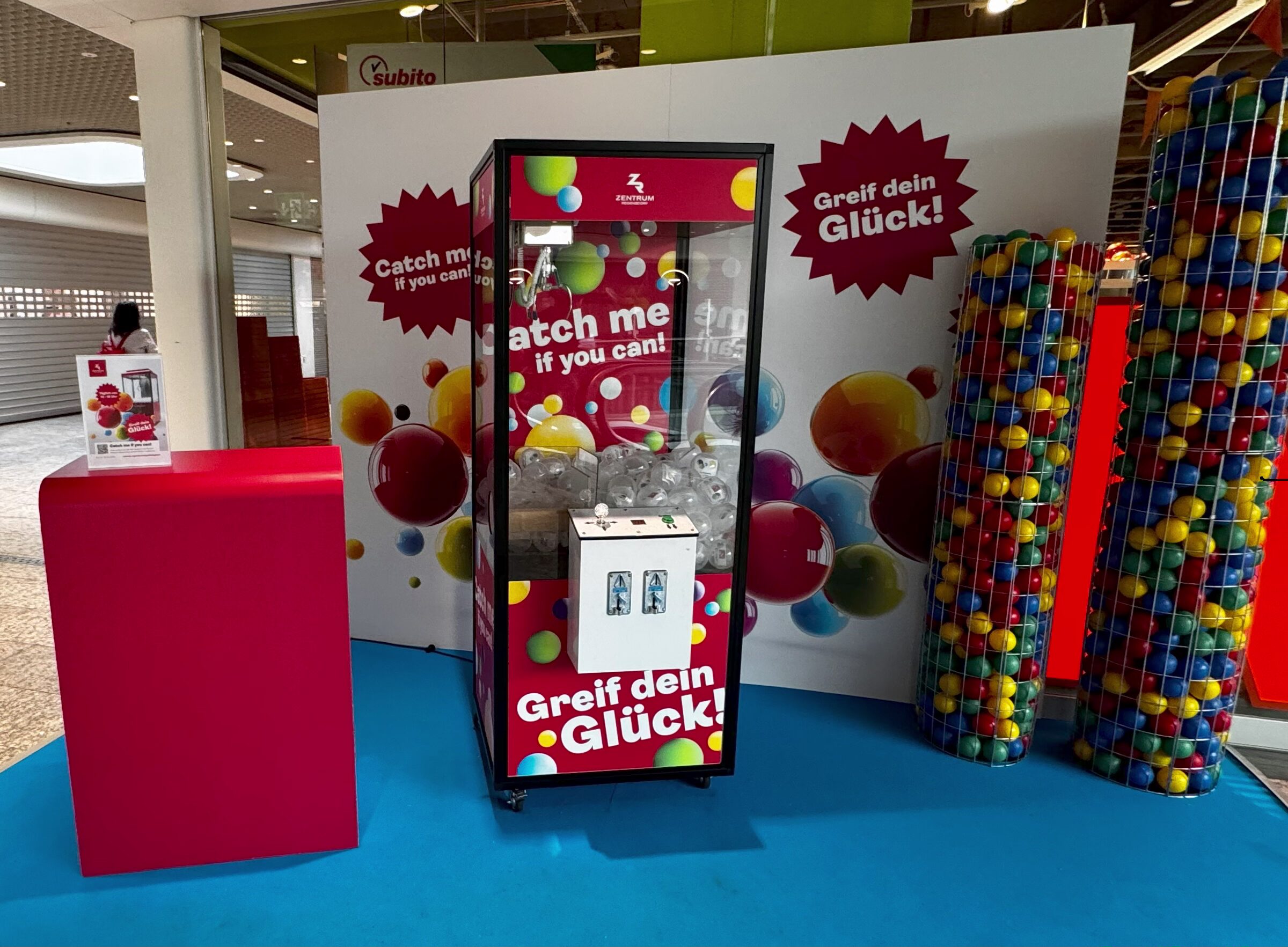 Greifarm–Automat. Unsere beliebten Greiferautomaten sind ideale Tools, um Give-Aways auf allen Arten von Messen, Events und Veranstaltungen zu verteilen. Auch Plüschtiergreifer genannt, gibt es hier viele Möglichkeiten, Ihr Produkt zu integrieren. Bedruckte Plüschtiere, Bälle oder leichte Waren. Waren sind im Mietpreis nicht inklusive!