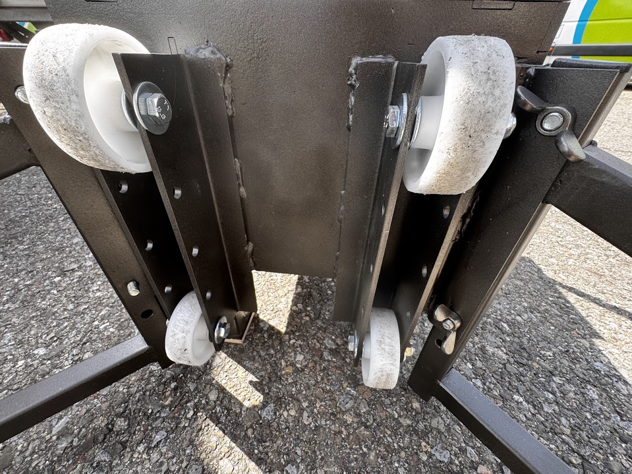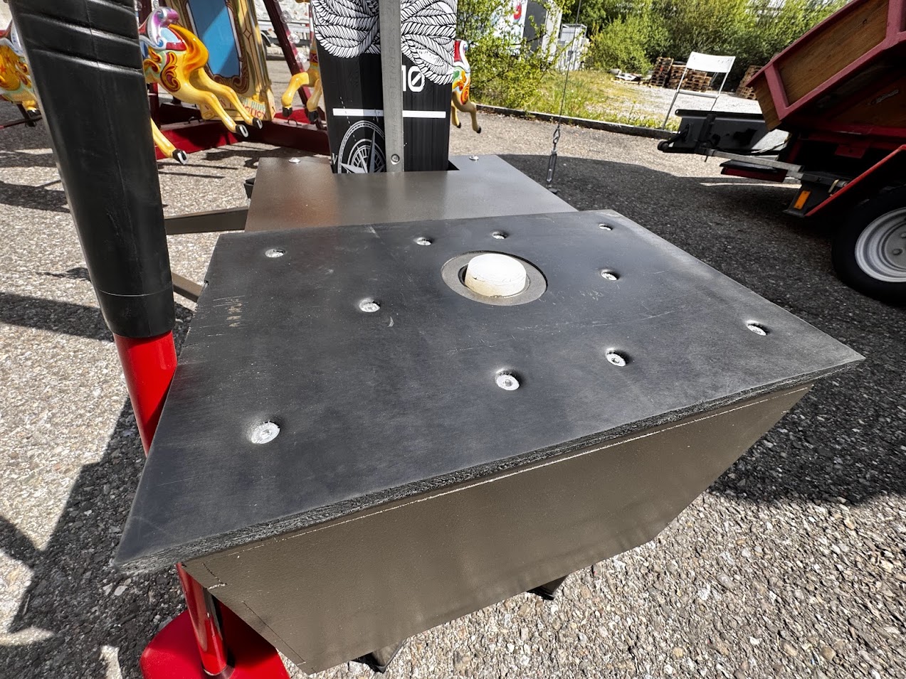 Das Gerät ist für den Transport zerlegbar. Schlagkasten auf Rollen, 2 x Stützen, 3 Teiliger Schlagbaum mit anschraubbarem Oberschild.