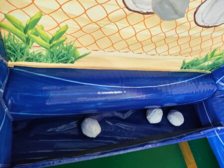 Es bestehen verschiedene Möglichkeiten der Spiele-Interaktion. Zum einen das Spiel Frisbee Pong, bei dem Frisbees in die Schlitze geworfen werden müssen. Diese werden dann in einem Sack aufgefangen. Das zweite Spiel wäre Kokosnüsse in ein Loch zu werfen und das dritte Spiel mit einer Handschleuder kleine Klettbälle an die Kokosnuss-Zielscheibe zu katapultieren. Sie können selbstverständlich auch nach Ihren eigenen Ideen diese Ziele nutzen und anderes Wurfmaterial dazu nehmen.