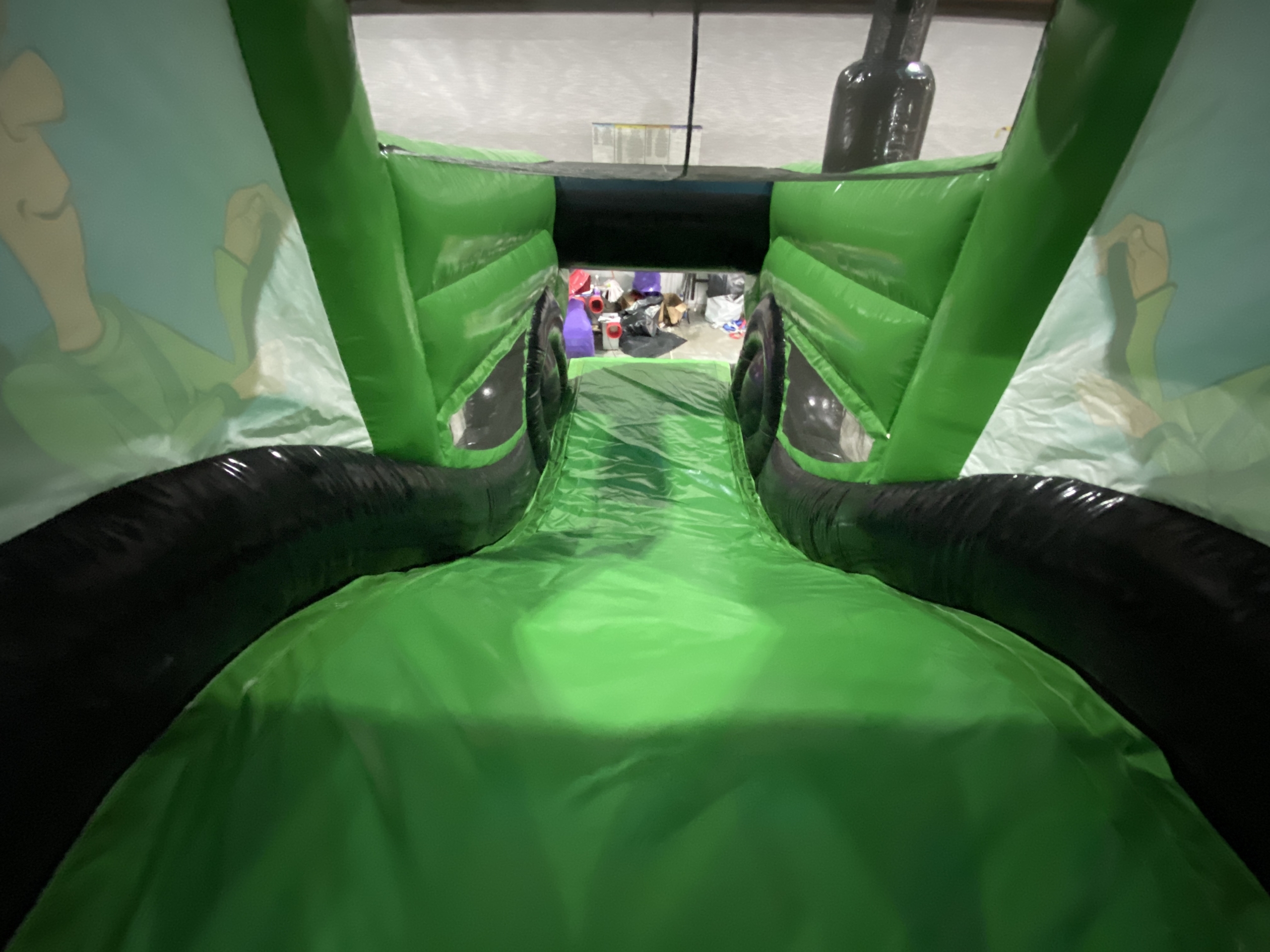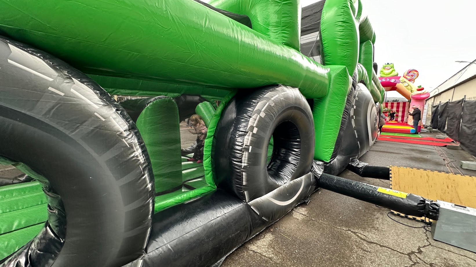 Lieferumfang: Hüpfburg, Fallschutzmatten, Gebläse, Unterlegplane, Kabelrolle, Sicherungsmaterial, Auf-/Abbauanleitung.