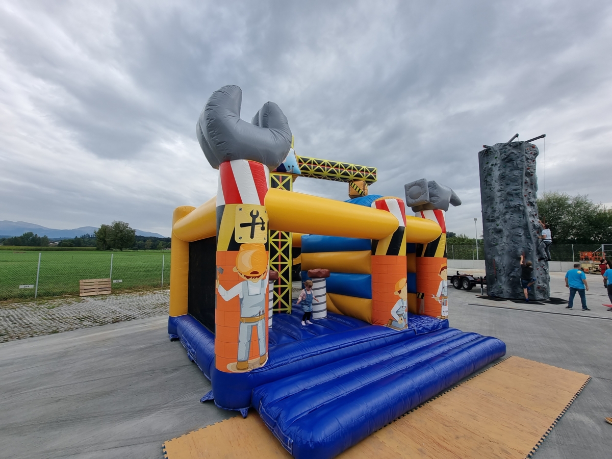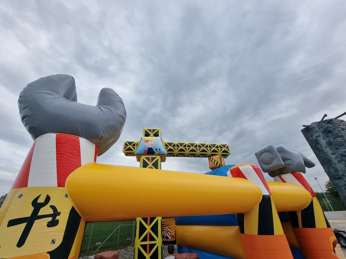 Dieses aussergewöhnliche Spielecenter ist sehr multifunktional! Die Hüpfburg Baustelle ist das Highlight für die kleinen Bauarbeiterinnen und Bauarbeiter. Die Bauarbeiter Hüpfburg ist eine tolle Mischung aus Hüpffläche mit Hindernissen und einer Rutsche. Ganz nach BOB der Baumeister können die Kleinen hier schrauben, hämmern und Kran fahren.