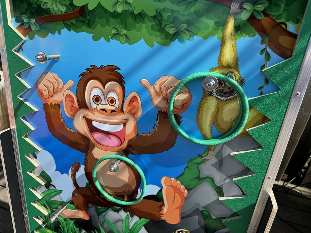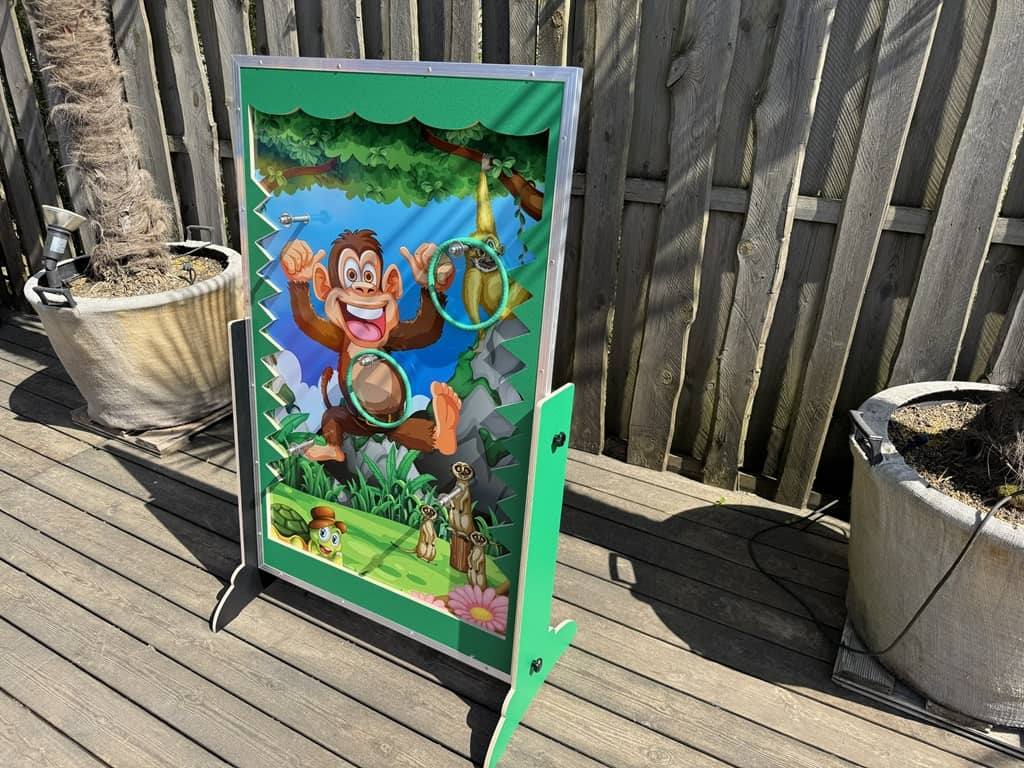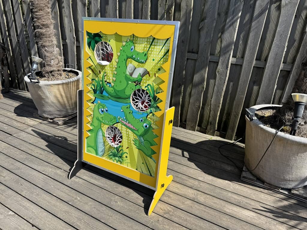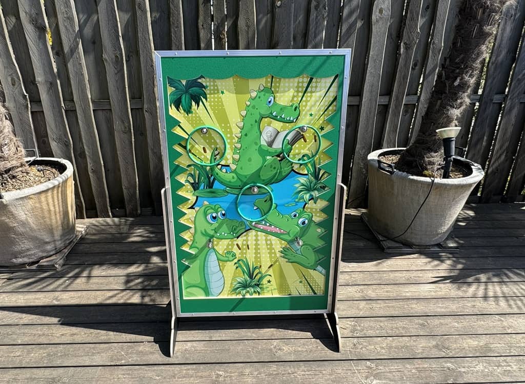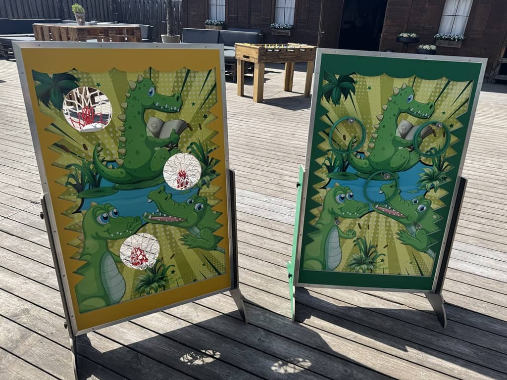 Wurfspiele zu verschiedenen Themen im tollen Design. Zum einen können die Kinder mit Ringen werfen welche dann an den Haken hängen bleiben, zum anderen Sandsäckchen in die Löcher werfen. Das Dino spiel ist mit einer Kinder-Armbrust an welcher dann die Saugnapfpfeile kleben bleiben.