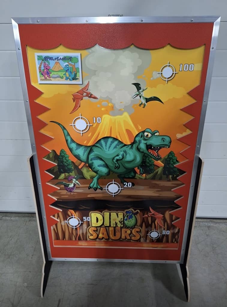 Wurfspiele zu verschiedenen Themen im tollen Design. Zum einen können die Kinder mit Ringen werfen welche dann an den Haken hängen bleiben, zum anderen Sandsäckchen in die Löcher werfen. Das Dino spiel ist mit einer Kinder-Armbrust an welcher dann die Saugnapfpfeile kleben bleieben.