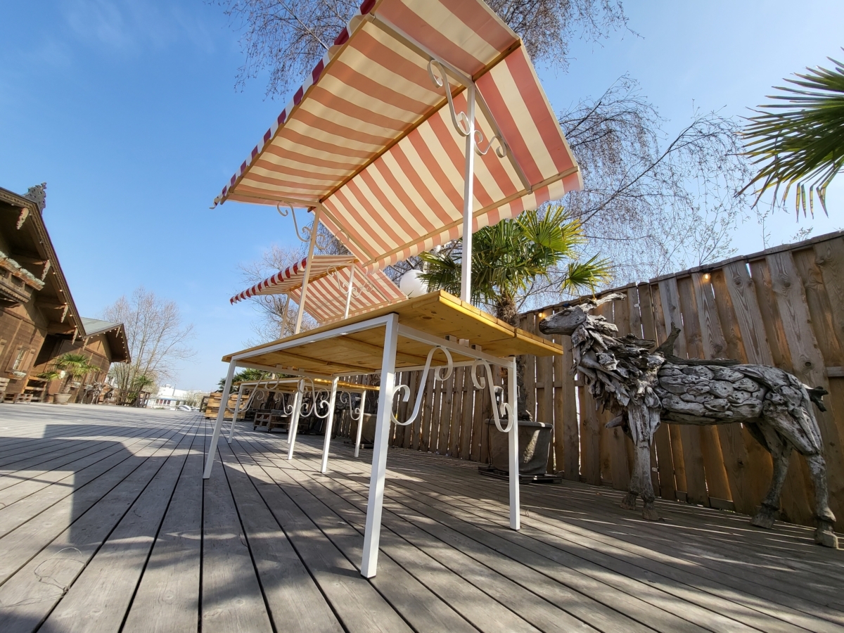 Marktstand Valencia mit wahlweise rot-weissem, blau-weissem oder gelb-weissem Dach.