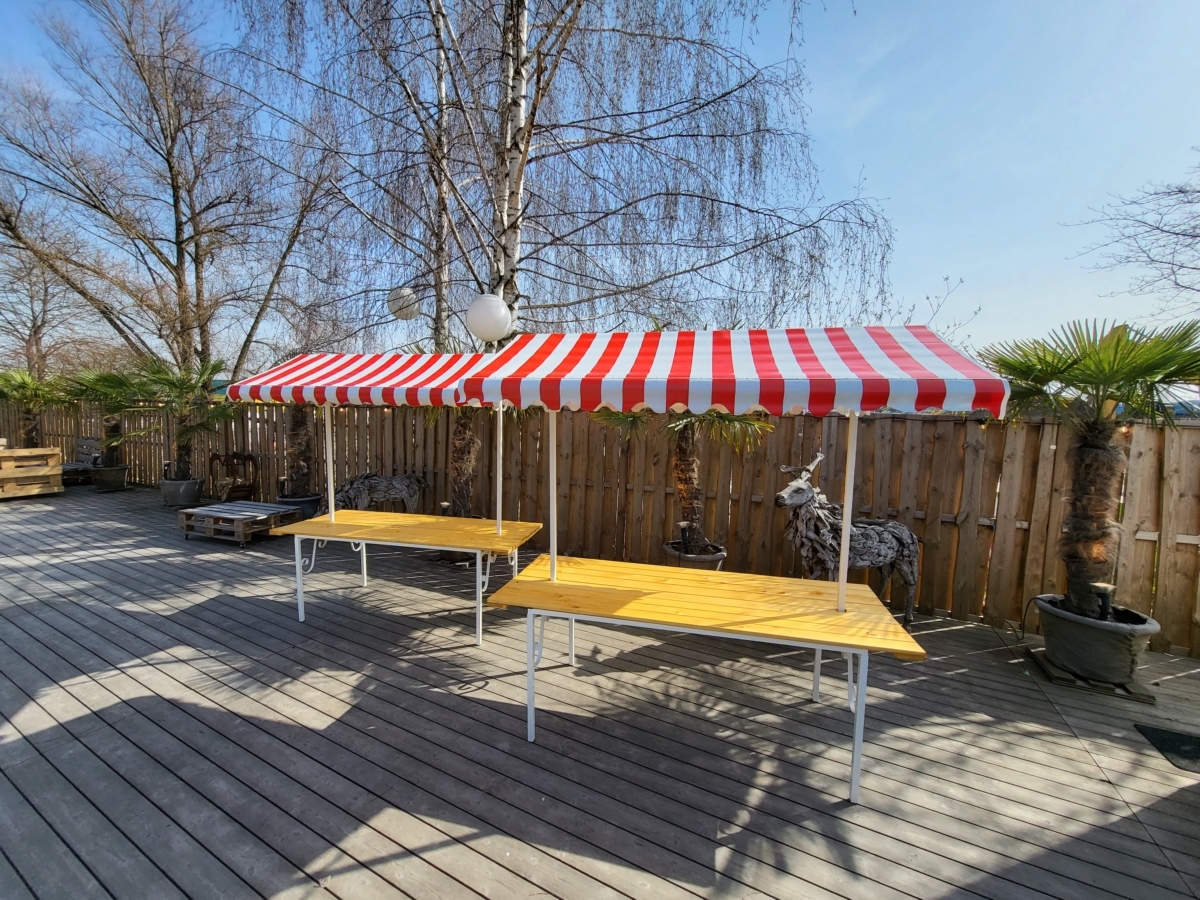 Die Stände sind einfach und schnell aufgestellt und ein schöner Blickfang für Ihre Kunden. Das Dach ist aus PVC und wasserdicht. Bei starkem Wind sind diese Stände nicht im aussenbereich einzusetzten.
