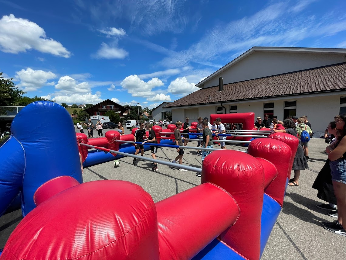 Lieferumfang: 1 x Aufblasbare Umrandung, Metallgestänge zerlegt, Bälle, Gebläse, Unterlegplane, Kabelrolle, Sicherungsmaterial, Auf-/Abbauanleitung.