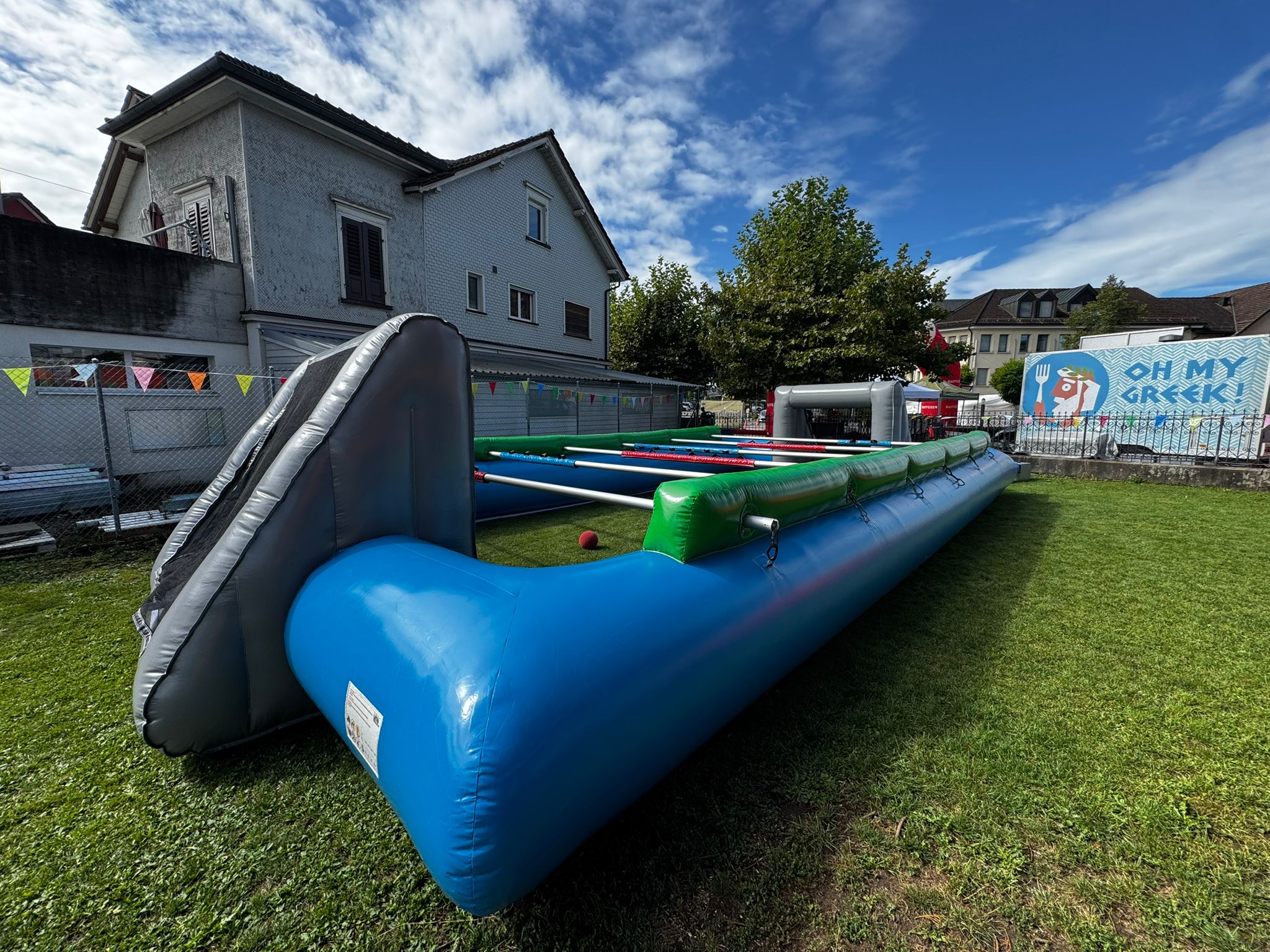 Lieferumfang: Aufblasbare Umrandung, Gebläse, Aluminiumstangen geteilt, 2 Bälle, Gebläse, Unterlegplane, Kabelrolle, Sicherungsmaterial, Auf-/Abbauanleitung.