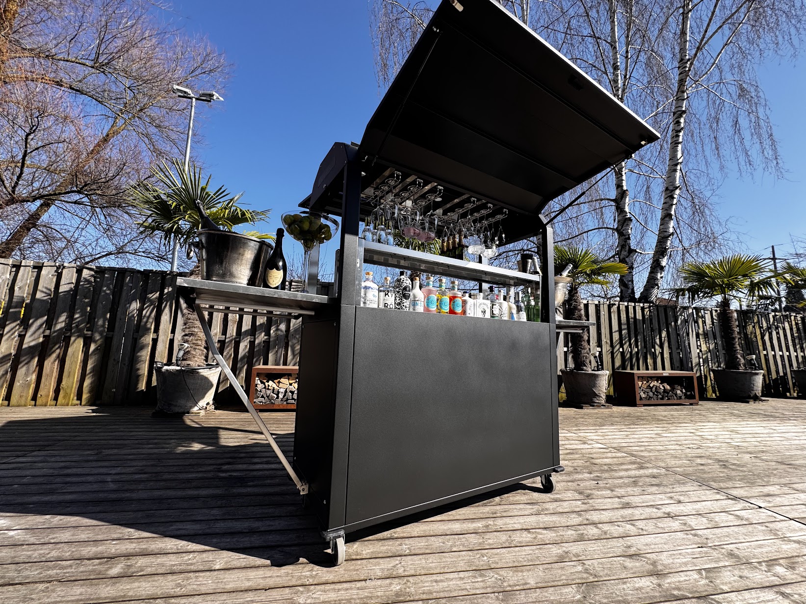 Der mobile Barwagen ist eine trendige und praktische Bar, die sich perfekt für die Ausgabe von Getränken, Snacks oder Kaffee eignet. Sie ist ideal für Branding, Catering und Verkaufsförderung. Mit praktischen Rädern lässt sich die Bar mühelos an jeden gewünschten Ort bewegen, wodurch er auch als Selbstbedienungsbar genutzt werden kann.