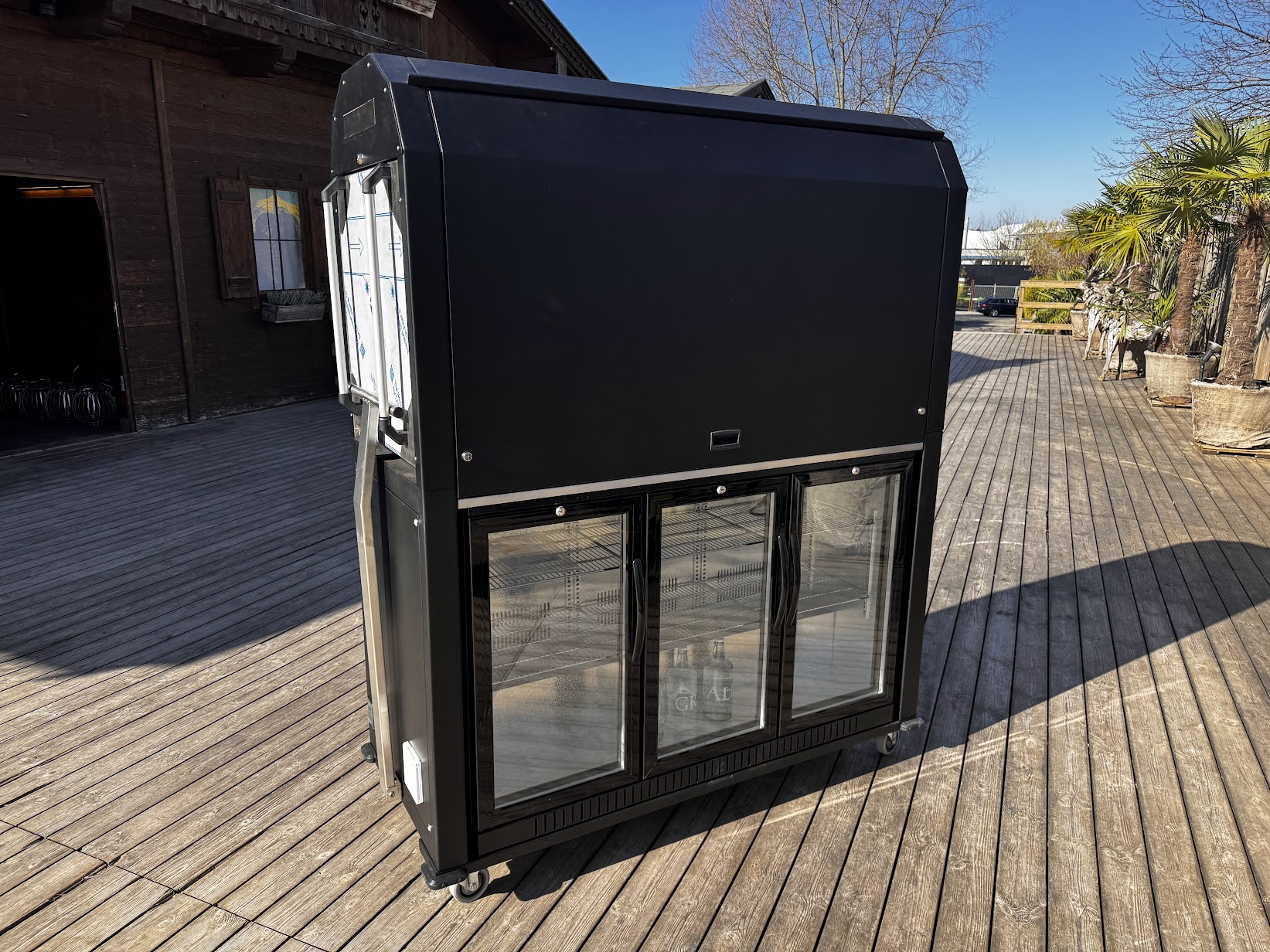Grösse des Eventmoduls: Länge 1,5m x Breite 0,65m x Höhe 2,0m/ Länge 2,7m x Breite 1,9m x Höhe 2,20m aufgeklappt mit Tischen