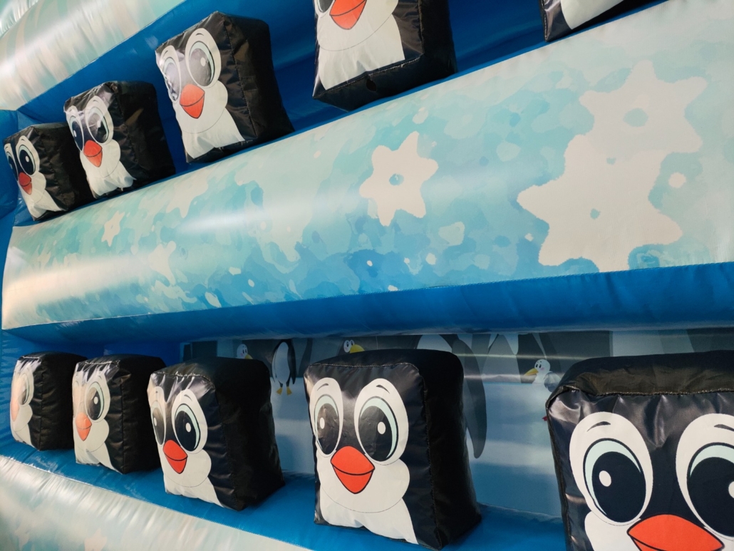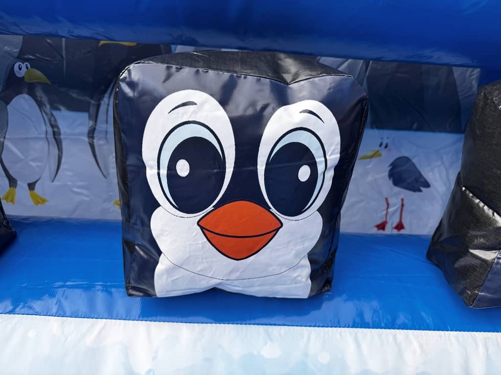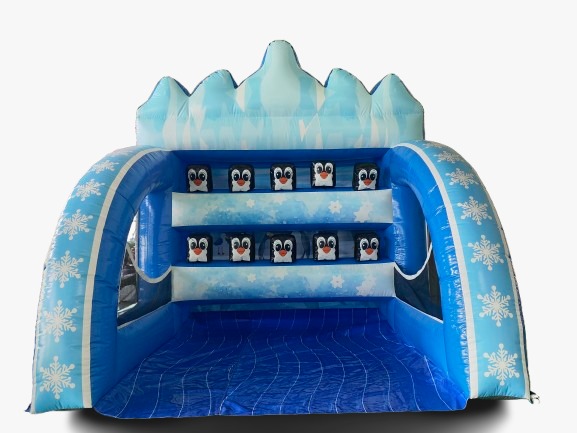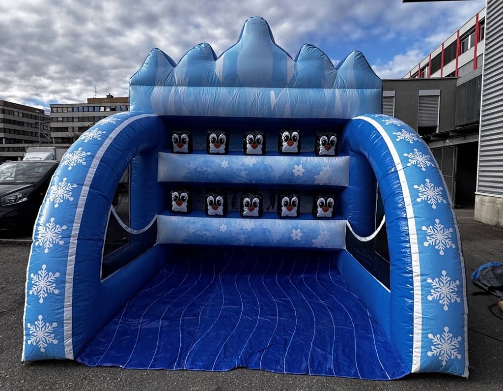 Aufblasbares Wurfspiel. Ein super Spassfaktor für Personen jeden Alters. Fördern Sie die sportliche Aktivität Ihrer Besucher und tragen Sie spannende Wettbewerbe aus. Die Pinguine bewegen sich auf und ab durch den Luftstrom des Gebläses. Die Kinder müssen nun mit Säckchen die Köpfe zu Fall bringen. Diese kippen dann nach hinten um. Wirft man zu doll, kommen diese wieder vor.