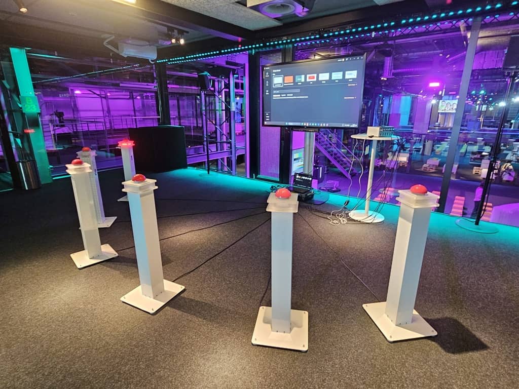 Mieten Sie hier unsere professionelle Buzzer Anlage für bis zu 12 Mitspieler für Ihre eigene Quizshow oder Spieleshow.