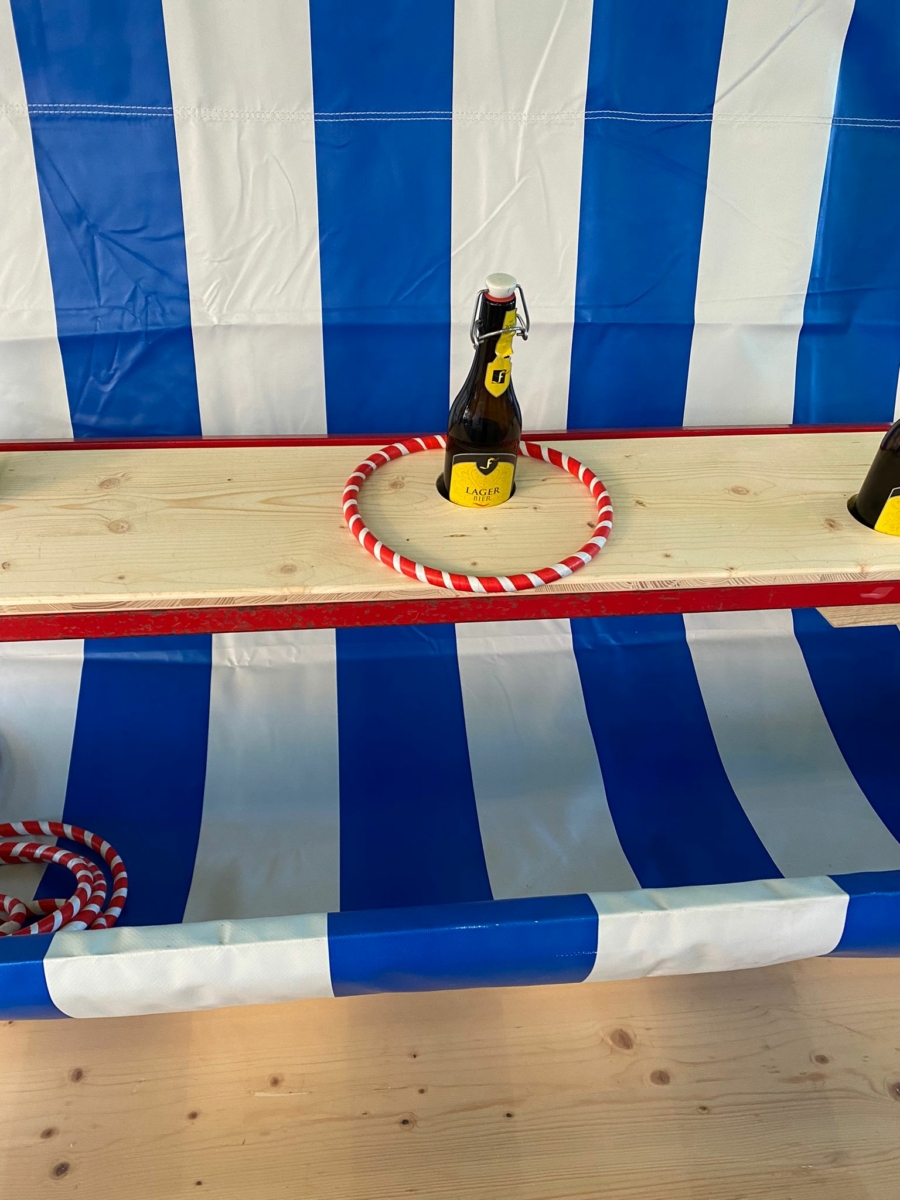 Ringe werfen original aus längst vergangener Zeit nun perfektioniert für die Bierolympiade. Wer trifft die meisten Ringe rund um den Flaschenhals. Geeignet für die Bierolympiade für das Teamevent oder für die Kids mit Fanta und Cola Flaschen. Je nachdem um welcher Flasche der Ring hängen bleibt gibt es die dementsprechend angezeigten Punkte. Jahrmarktattraktionen mieten bei Arena der Wunder.