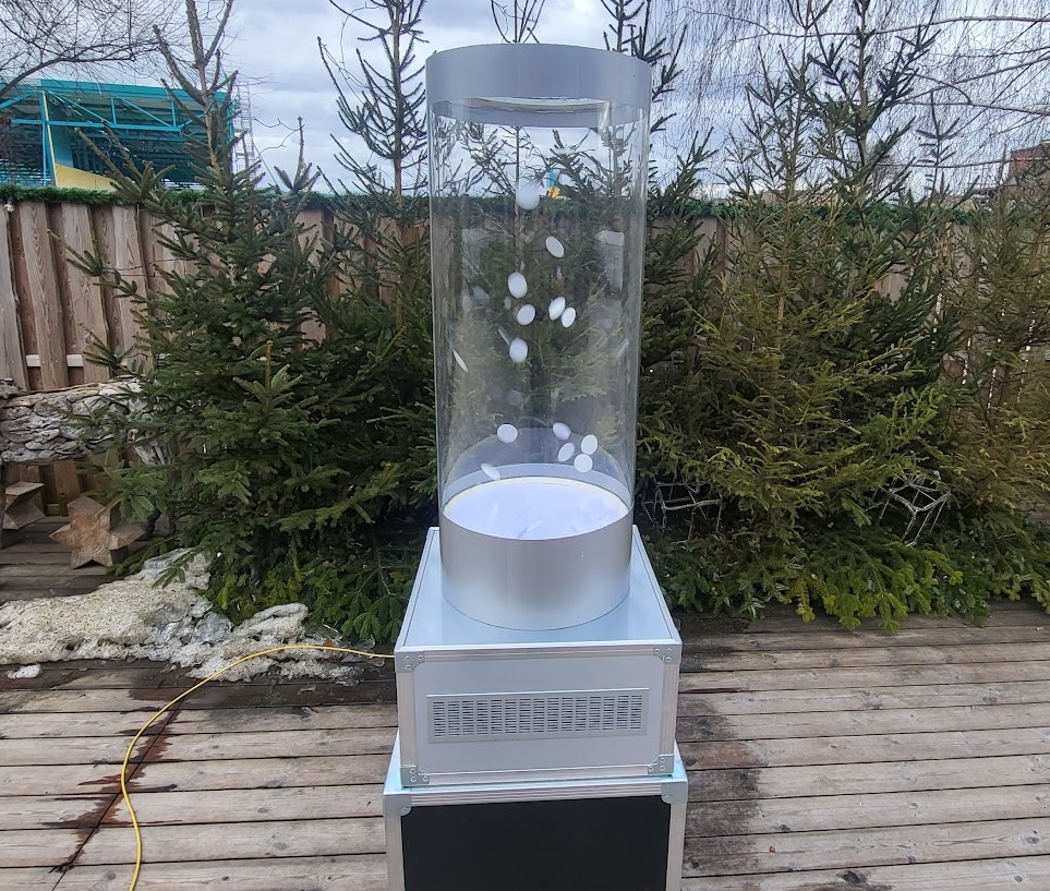 Immer wieder beliebt ist das Schätz- und Ratespiel. Unsere Schätzbox als Luftsäule fällt auf. Im Innern der Säule wirbelt es farbige Plättchen umher. Wie viele?, das wissen nur Sie!