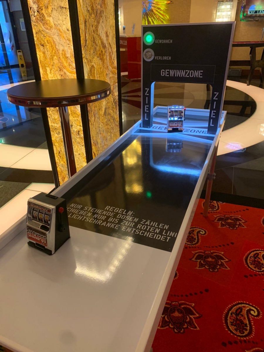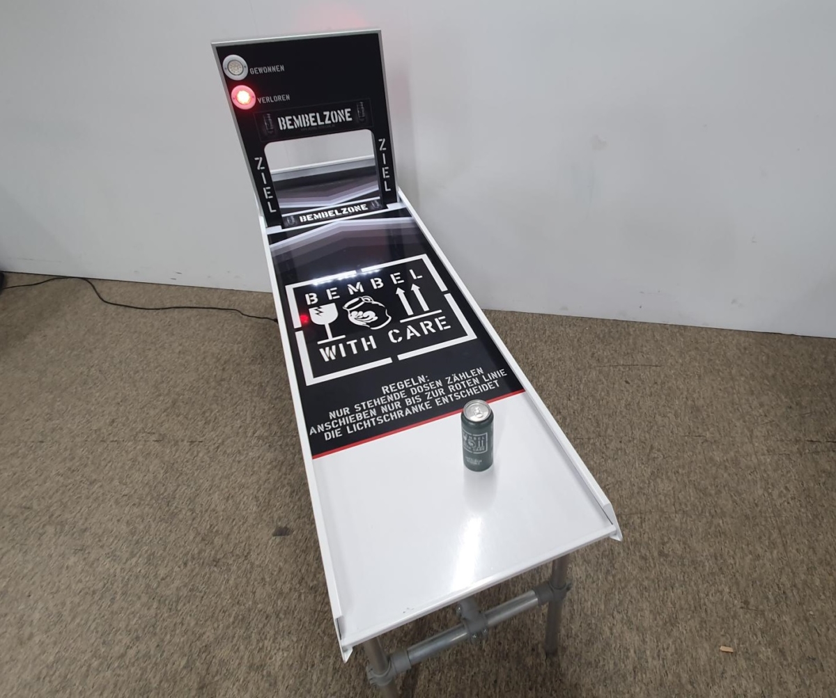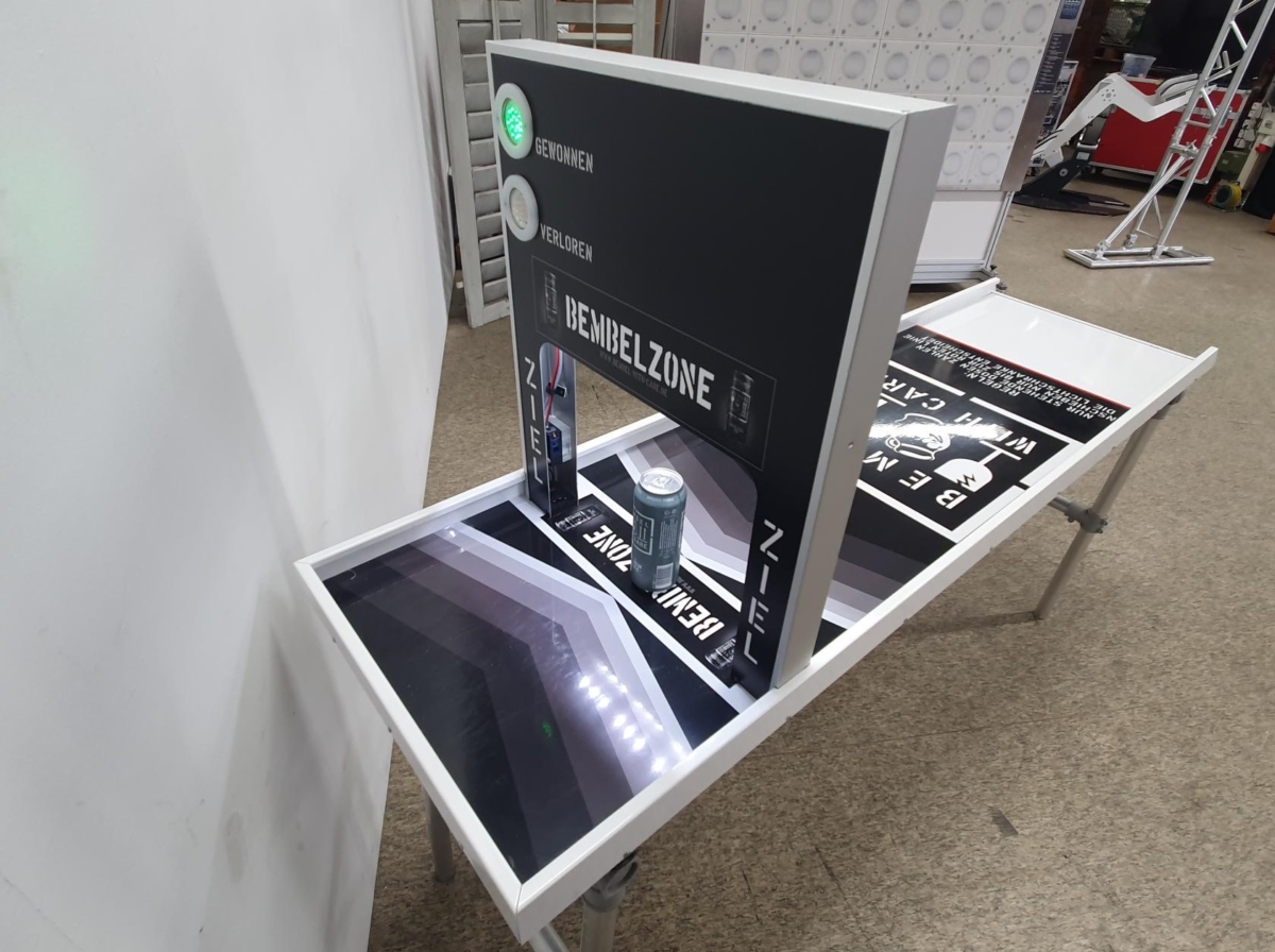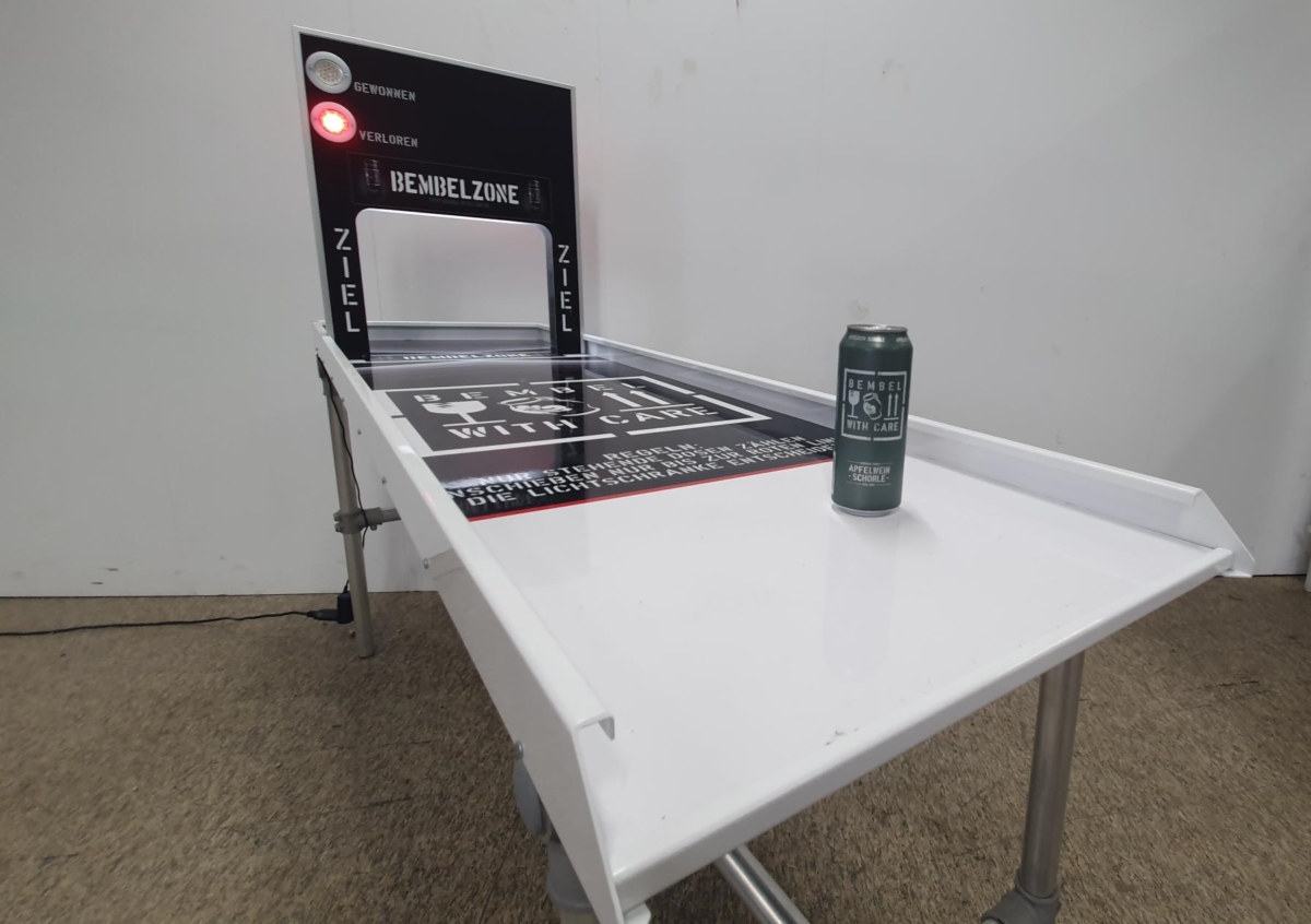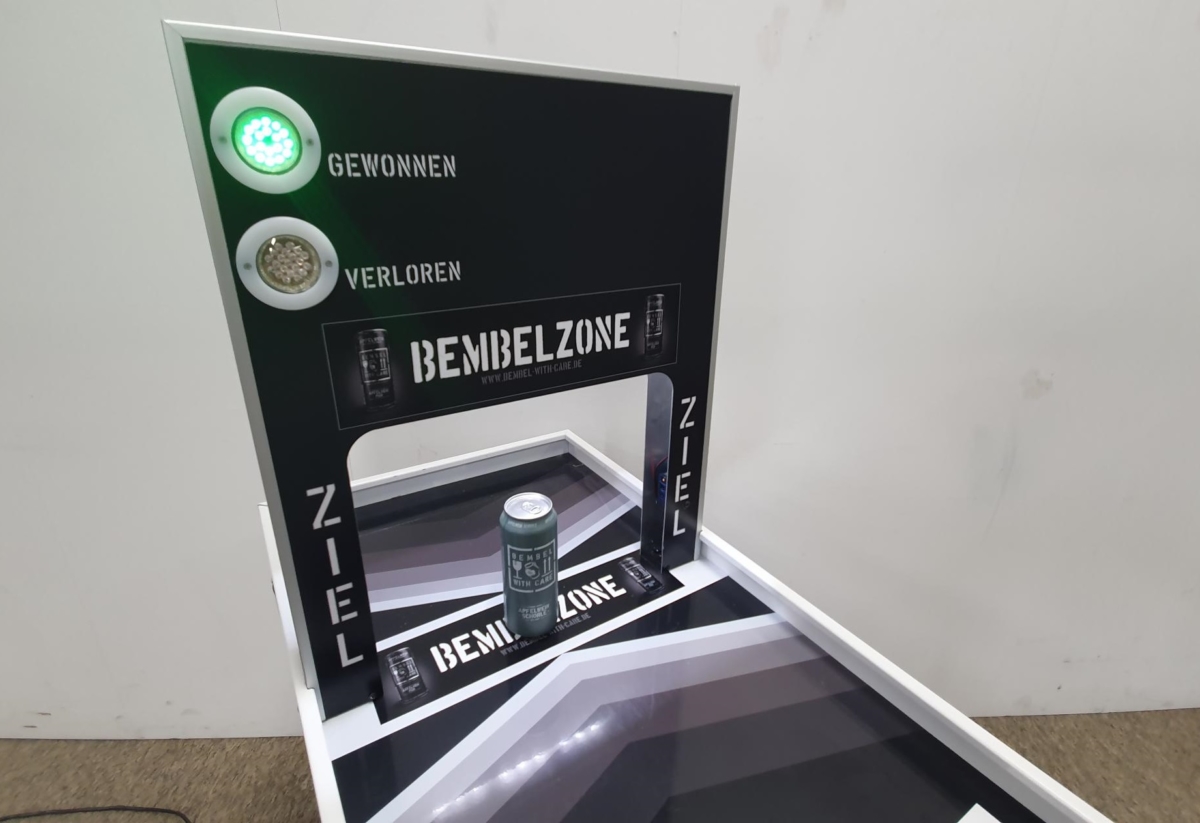 Ganz leicht ist es aber nicht das Spielobjekt genau im Gewinnabschnitt zum Stehen zu bekommen – tatsächlich kommt es auf den richtigen Schwung an. Eine Laserschranke misst präzise genau den Bereich, in dem das Kundenprodukt stehen bleiben darf. Ob man gewonnen oder verloren hat, zeigt eine grüne bzw. rote LED-Leuchte auf der Brücke an. Diese kann auch individuell gebrandet werden.