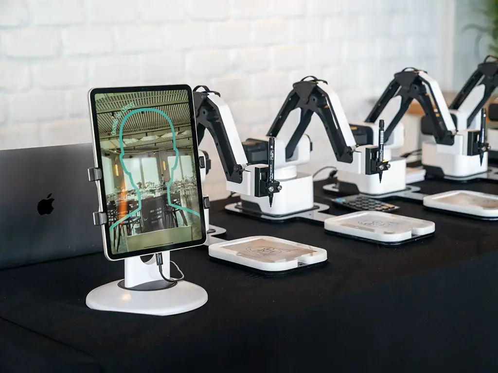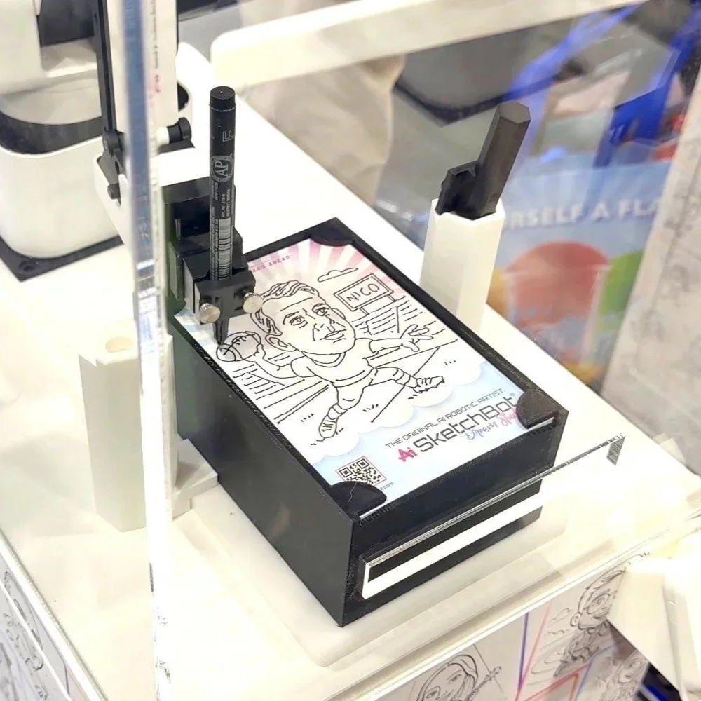 Beim Sketch Bot erleben Gäste hautnah, wie aus einem Foto Schritt für Schritt ein handgezeichnetes Kunstwerk entsteht. Der Ablauf beginnt mit einer animierten Aufnahme über das Tablet. Danach greift der Roboterarm zum Stift und zeichnet live vor den Augen des Publikums – ein Erlebnis, das Technologie, Kunst und Unterhaltung perfekt miteinander verbindet. Das Ergebnis ist ein einzigartiges sehr hochwertiges Andenken, welches die Besucher mit nach Hause nehmen und immer wieder an Ihr Event erinnert.
