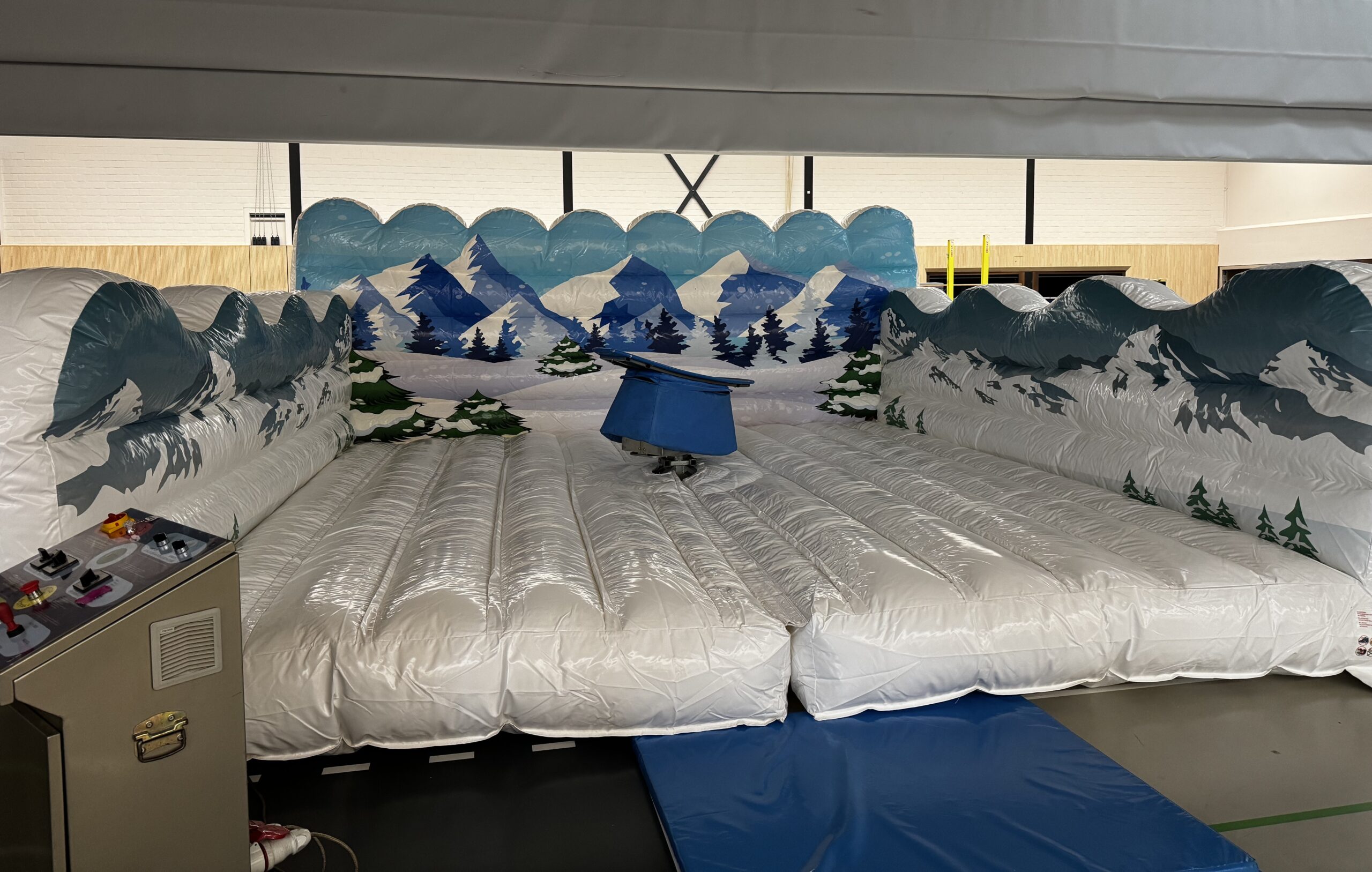 Lieferumfang: Steuergerät mit Snowboard, aufblasbares Kissen, Fallschutzmatten, Gebläse, Unterlegplane, Kabelrolle, Sicherungsmaterial, Auf/Abbauanleitung.