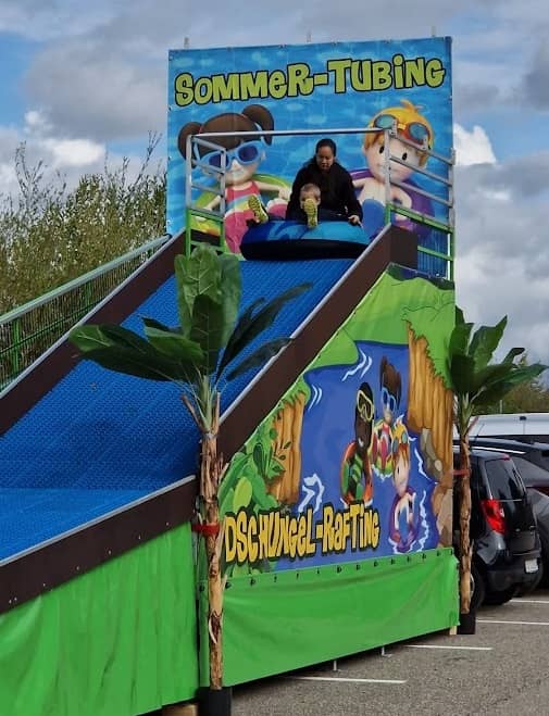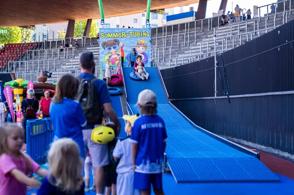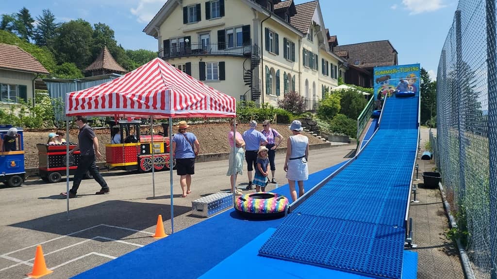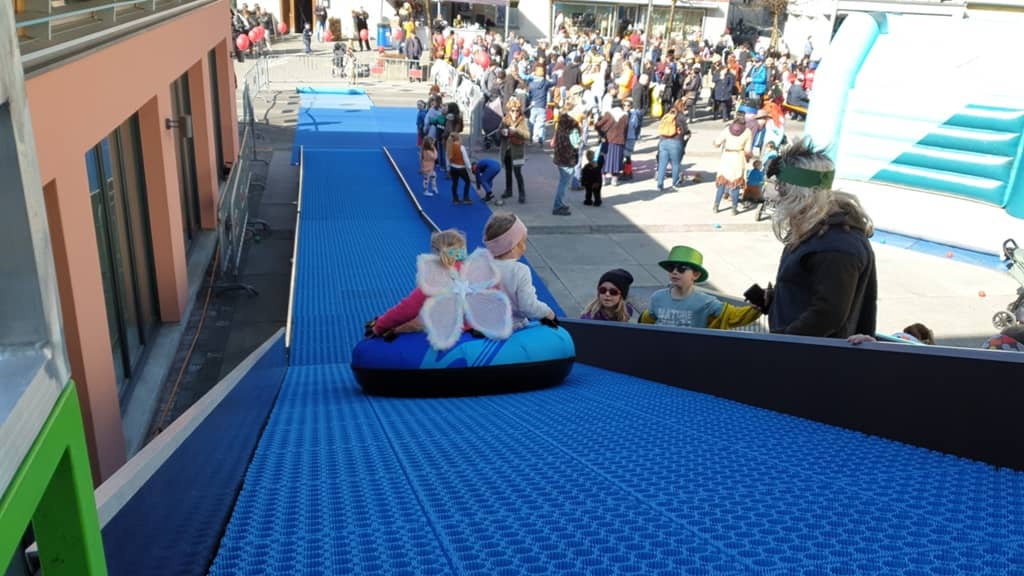 Unsere mobile Tubing Bahn bringt überall jede Menge Aufmerksamkeit. Ein riesen Spass für die ganze Familie. Dank des speziellen Belags können hier die Teilnehmer ganzjährig rodeln. Egal ob es regnet, schneit oder die Sonne scheint, unsere Rodelbahn ist immer einsatzbereit. 1 Animateur hilft oben beim Einstieg in die Tubes und sorgt dafür, dass die Tubes immer bereit sind.