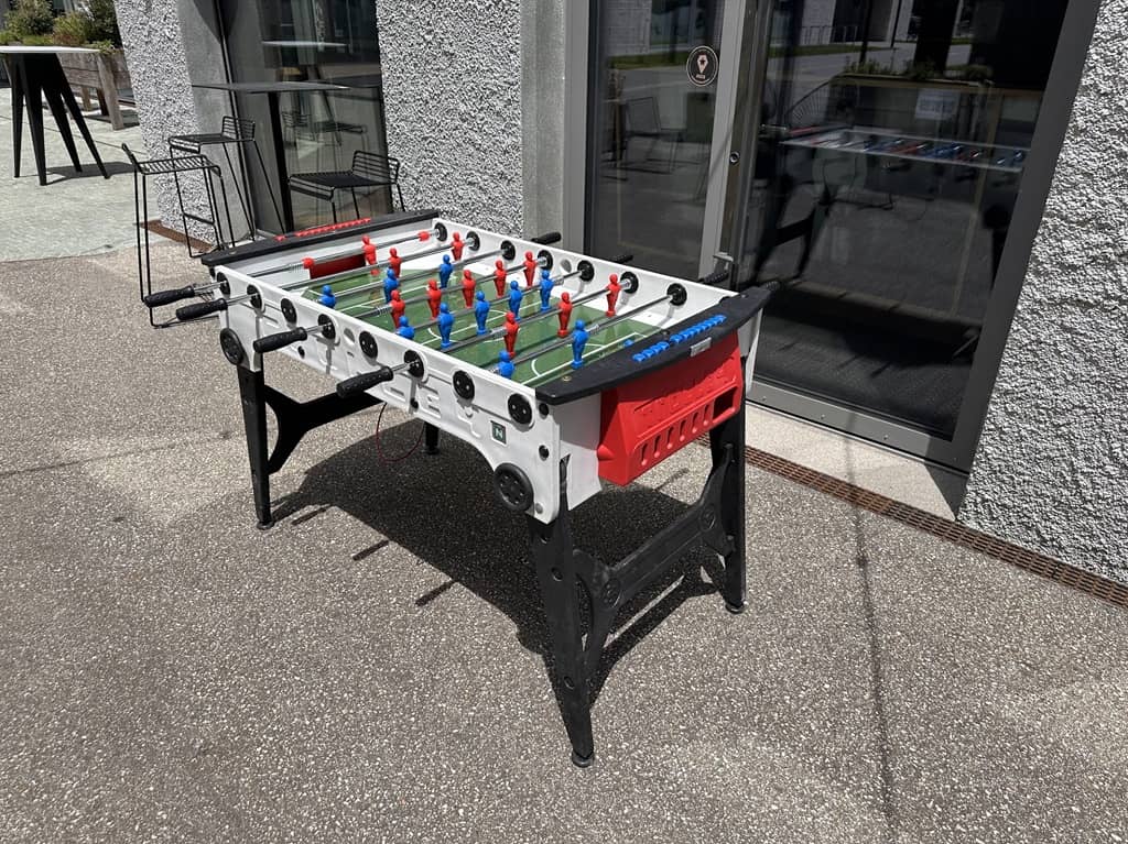 Anmerkungen: Spezieller outdoor Kicker, welcher auch mal im Regen stehen kann. Wenn hier Getränke verschüttet wird, kann dieser Tisch einfach gereinigt werden.