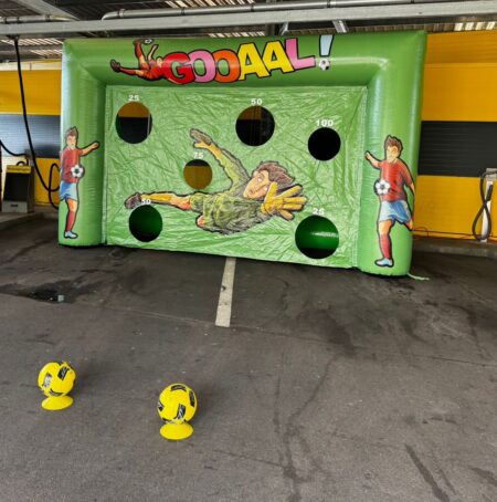 Lieferumfang: Aufblasbare Torwand, Gebläse, 3 Bälle, Kabelrolle, Sicherungsmaterial, Auf-/Abbauanleitung.