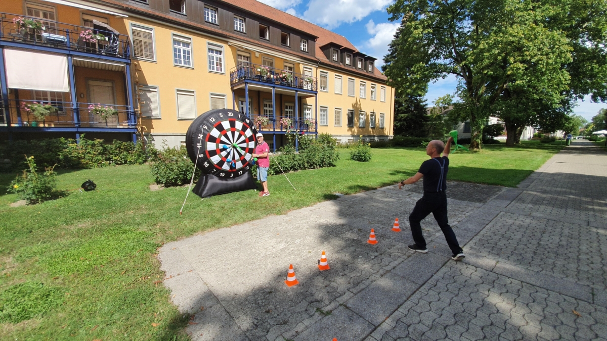 Aufblasbares riesen Dart mieten. XXL riesen Dart als aufblasbare Spieleattraktion. Wie beim normalen Dart, werfen Sie hier mit Soft Darts mit Klettverschluss auf die riesige Scheibe.