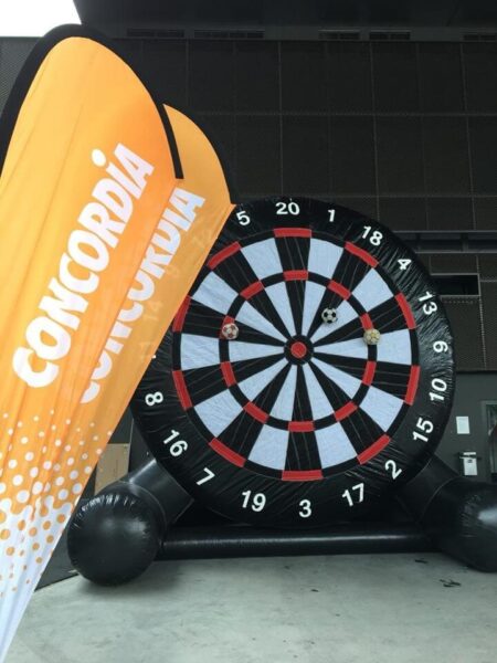 Fussball und Darts: Das ist eine Kombination, die viel Spass und Action verspricht! Unsere aufblasbare Fussball-Dartscheibe im XXL-Format bringt diesen Spass auf Ihr Event. Die Regeln sind die gleichen, wie beim herkömmlichen Darts, nur dass nicht mit Pfeilen geworfen, sondern mit Fussbällen auf die zwanzig Teilbereiche der Scheibe (jeweils mit Ringen für doppelte und dreifache Punktzahl) und das Bullseye in der Mitte geschossen wird.